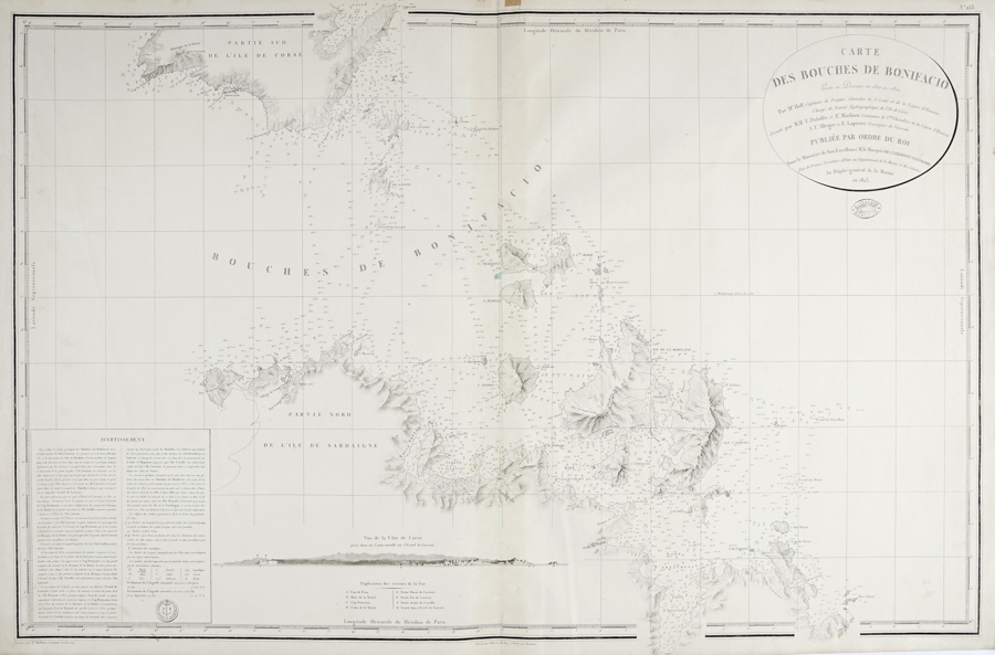 Ambroise Tardieu, Carte des Bouches De Bonifacio Levée et Dressée en 1821 et 1822 Par M.r Hell Capitaine de Frégate... Paris: Au Dépôt-général de la Marine, 1823. Incisione in rame. mm 615x948. Foglio: mm 644x982. Carta nautica di Bocche di Bonifacio ovvero di quel tratto di mare tra la Sardegna e la Corsica, che nel suo punto più vicino alla terraferma, nel comune francese di Bonifacio che gli dà il nome, dista dalle coste circa 11 km. Lo stretto è delimitato dal borgo francese di Bonifacio in Corsica e dall'attuale Santa Teresa di Gallura in Sardegna. Disegnata dal tenente di vascello A.e Mathieu, la mappa presenta numerosi dettagli topografici e nautici riguardanti le coste contigue di ciascuna delle isole, incluse indicazioni di navigazione dettagliate quali fari, scandagli, ecc. Accurata la resa delle isole tra le quali Maddalena e Spargi, Lavezzi, Cavallo e Ratino. In basso a sinistra tabella con le Avvertenze e di fianco una vista di profilo della costa della Corsica. (1)