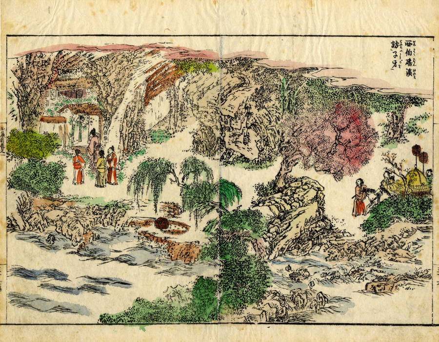 Artista giapponese di epoca Meiji, Quattro tavole di vario soggetto. Xilografia in nero (sumizuri-e). Coloritura a mano aggiunta successivamente. Formato: hanshibon (doppia pagina mm 198x238). Due tavole componenti il lotto recano sul montaggio la scritta a matita "Yamano" le altre due "Gyokusai". (4)