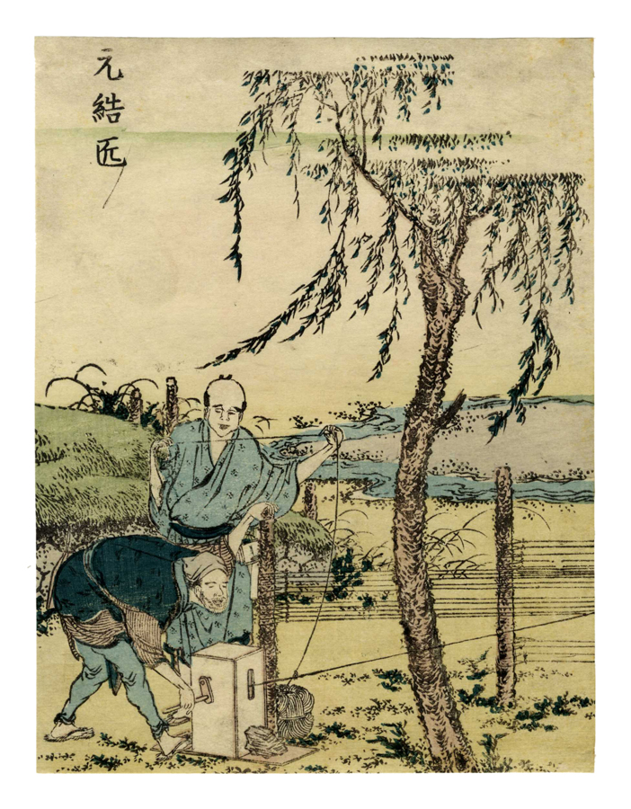 Katsushika Hokusai, Armaiolo / Venditore di cordoncini in carta per capelli. 1802 (Kyōwa 2). Xilografia a colori (nishiki-e). Formato: Hanshibon (mm 192x147/152). Editore: Tsutaya Juzaburo. Dall'opera in due volumi Ehon azuma asobi (Libro illustrato dei piaceri della capitale orientale) pubblicata per la prima volta in bianco e nero nel 1799 e nuovamente a colori nel 1802. Per la casualità dei soggetti, pare che le tavole fossero originariamente destinate a un volume sui luoghi famosi di Edo, ma siano state frettolosamente riproposte per l'antologia kyôka (componimenti in versi popolari giocosi) di Capodanno. Nel 1802, le illustrazioni furono usate di nuovo, ma riorganizzate per il loro scopo originale, e senza i componimenti kyôka, nella guida a colori ai luoghi famosi di Edo pubblicata dallo stesso editore, Tsutaya Juzaburo. (2)