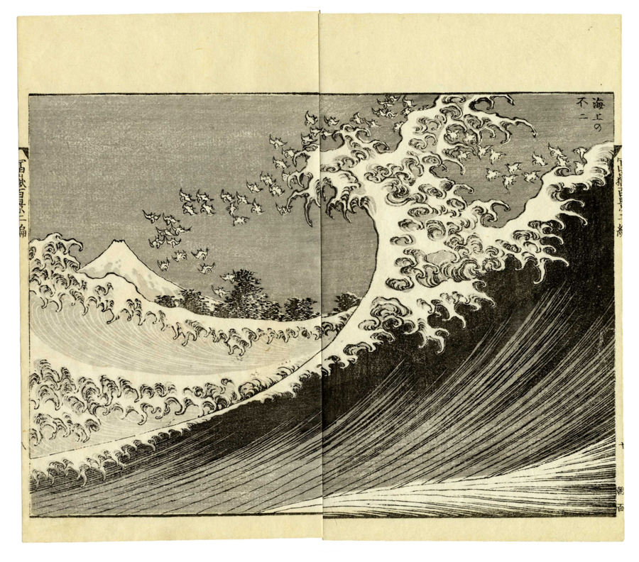 Katsushika Hokusai, Kaijo no Fuji (Il Fuji dal mare). 1835-1850. Xilografia in bianco/nero e grigio (sumizuri-e). Formato: hanshibon (doppia pagina mm 226x257). Editore: Eirakuya Toshiro, Kakumaruya Jinsuke,Nishimuraya Yohachi e Nishimuraya Yuzo. Censura: assente. Data: 1835-1850 ca. Serie: Fugaku Hyakkei (Le cento vedute del monte Fuji), tavola dal II volume. (1)