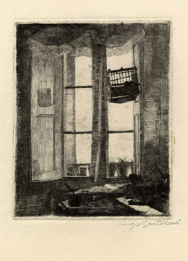 Luigi Bartolini, La finestra del solitario. 1925. Acquaforte su carta Cina applicata a carta pesante. mm 199x158. Foglio: mm 475x335. ESEMPLARI UNICI E RARI, 13; MARINO, 203; FICACCI, 78. Esemplare nel I stato su 2 prima del rinforzo delle ombre e dei tratti sull'imposta di sinistra e l'aggiunta della firma. Titolata in lastra "Il Compagno" in basso a destra. Firmata a matita in basso a destra. Timbro a secco con nome dell'Artista in basso a destra. Etichetta contenente titolo e numero di taratura all'angolo superiore sinistro del verso. Es. 21/25. (1)
