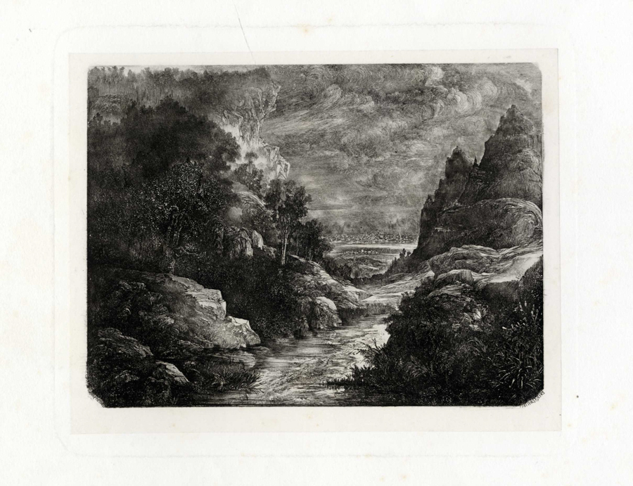 Rodolphe Bresdin, Le ruisseau des gorges. 1871. Riporto litografico di un'acquaforte su carta Cina applicata. mm 111x147. Foglio: mm 275x360. VAN GELDER, 130. Doppiamente firmata e datata in lastra agli angoli inferiori. (1)