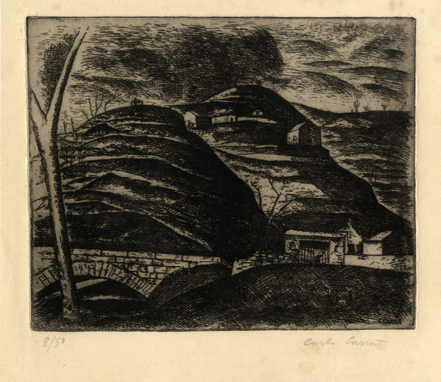 Carlo Carrà, Cengio. 1922. Acquaforte. mm 216x266. Foglio: mm 320x410. CARRA', 7. Firmata in lastra in basso a destra, controfirmata a matita al margine inferiore destro. Numero di tiratura indicato a matita in basso a sinistra. Es. 8/50. (1)