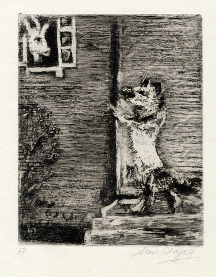 Marc Chagall, Le loup et la chevre. 1927-30. Acquaforte. mm 300x240. Foglio: mm 420x335. vollard, 140. Firma a matita in basso a destra, controfirma in lastra in basso al centro. Altre iscrizioni a matita al margine inferiore. (1)