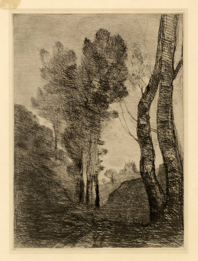 Jean-Baptiste-Camille Corot, Environs de Rome. 1866. Acquaforte. mm 280x205. Foglio: mm 416x306. Timbro a secco al margine superiore. (1)