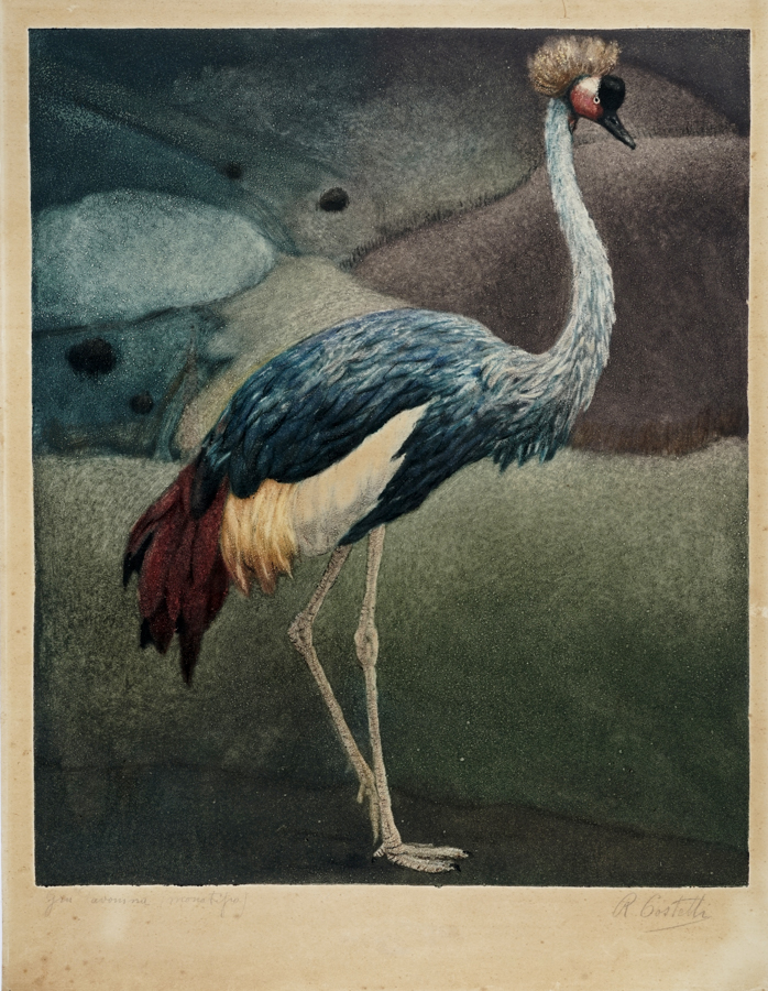 Romeo Costetti, Gru pavonina. Monotipo. mm 505x420. Foglio: mm 593x460. Firmato a matita in basso a destra, titolato a matita in basso a sinistra. Iscrizioni illeggibili a matita in alto a sinistra del verso. (1)