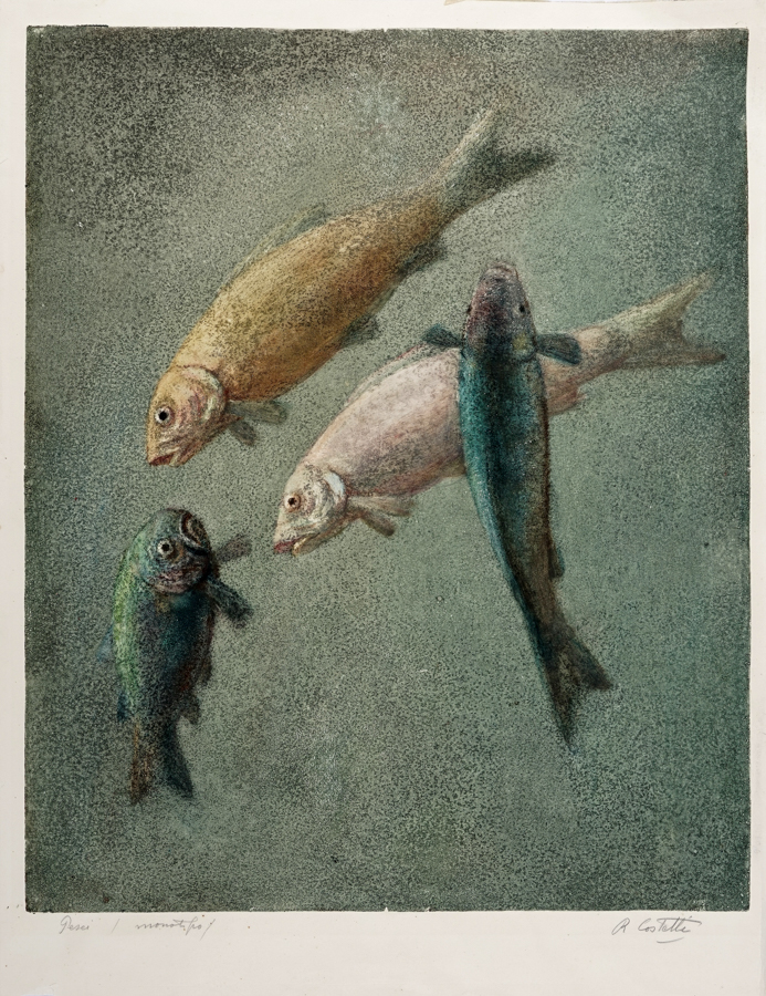 Romeo Costetti, Pesci. Monotipo. mm 565x465. Foglio: mm 650x500. Titolato e firmato a matita in basso ai lati. (1)
