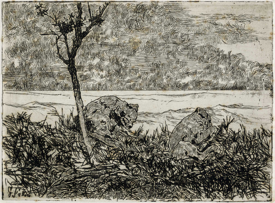 Giovanni Fattori, I miei cani pomeri. Acquaforte su zinco. mm 150x195. Foglio: mm 295x425. Baboni-Malesci, LXVIII. Firmata nella lastra in basso a sinistra. (1)