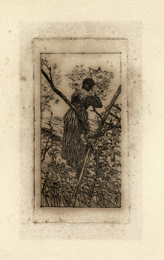 Giovanni Fattori, Raccoglitrice di foglie. Ante 1888. Acquaforte su zinco. mm 196x101. Foglio: mm 365x273. baboni-malesci, LXVI. Meraviglioso esemplare in tiratura coeva, conosciuto anche con il titolo La potatrice (ghiglia, XLII). Questa acquaforte fa parte delle 21 che la G.A.A.M di Roma acquistò il 3 settembre 1888 dalla Calcografia Nazionale per cui è databile agli anni precedenti. Essa è riferibile, con lievi variazioni compositive, al disegno a penna Raccoglitrice di foglie e Paesaggio, esposto ad Amsterdam nel 1969 ed ai due dipinti Tre impressioni e La pulitura delle viti. Rara. (1)