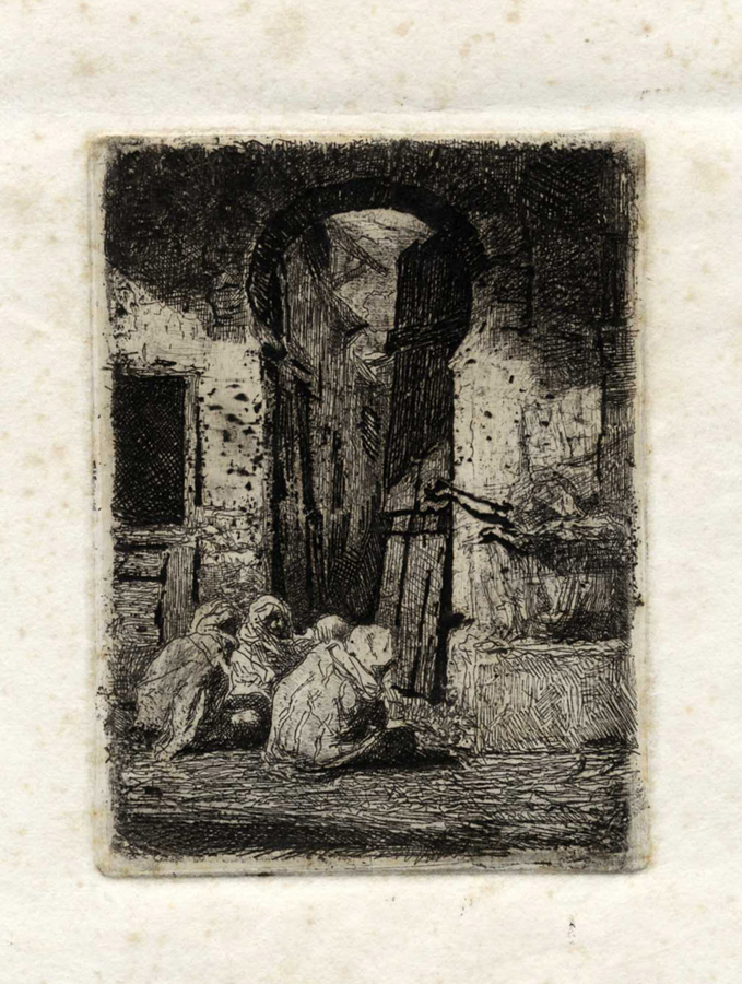 Mariano Fortuny y Marsal, Tanger. 1861 ca. Acquaforte. mm 95x71. Foglio: mm 240x170. Vives i Pique/Cuenca Garcia, 17. Esemplare in prima tiratura privo di iscrizioni e con varianti. In particolare è completamente tracciato e visibile il braccio proteso dell'arabo seduto a destra. Annotato a penna sul retro: "4a ac. P. 3. con varianti dalla 1a M. Fortuny. Sta in Roma" probabilmente di mano dell'autore stesso. Pertanto la data (?) "83" apposta in piccolo a seguire sarebbe da ritenersi di altra mano e aggiunta successivamente. Si ritiene quindi trattarsi di una rarissima prova di stampa forse unica. (1)