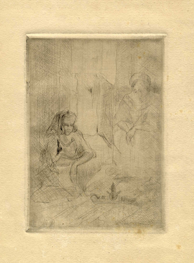 Natal'ja Sergeevna GonÄarova, Incisione da Le the du Capitaine Sugou. 1926. Puntasecca su carta vergellata con filigrana. mm 140x95. Foglio: mm 275x285. Dati anagrafici dell'artista ed indicazioni di provenienza iscritti a matita al verso. Tavola incisa estratta dall'opera di Joseph Kessel. (1)