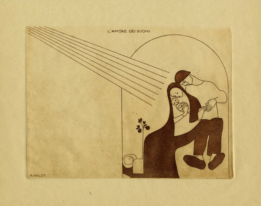 Adolfo Wildt, L'amore dei buoni. 1919 ca. Acquaforte e acquatinta. mm 195x265. Foglio: mm 275x350. Rotunno, 2; Parisi 5. Titolata in alto al centro. In basso a sinistra, sempre nell'inciso, "A. Wildt". (1)