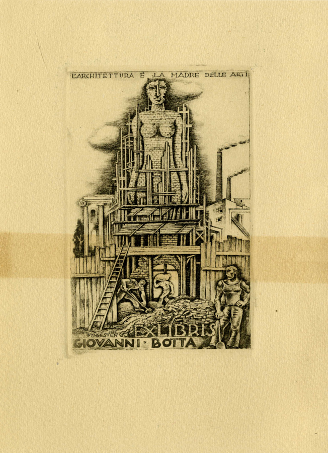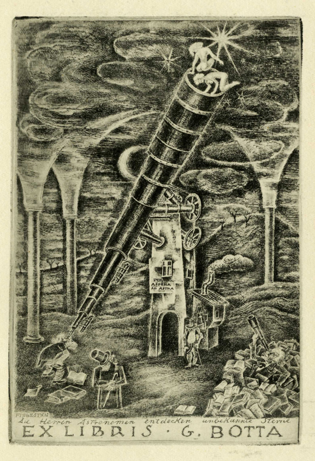 Michel Fingesten, Lotto composto di 3 ex libris. 1) Ex libris Giovanni Botta. L'architettura è la madre delle arti. 1938. Fotoincisione. mm 130x80. Foglio: mm 215x155. MIRABELLA-BARDAZZI-BALLERINI. N 336. Timbro dell'artista al verso. 2) Ex libris Giovanni Botta. Die Herren Astronomen entdecken un bekannte Sterne. Fotoincisione. mm 140x95. Foglio: mm 155x105. MIRABELLA-BARDAZZI-BALLERINI. N 337. 3) Ex libris Giovanni Botta. Pierrot Lunaire e Geblumet und durchsusset sind die holden Frauer. Fotoincisione. mm 110x70. Foglio: mm 160x113. MIRABELLA-BARDAZZI-BALLERINI. N 338. (3)