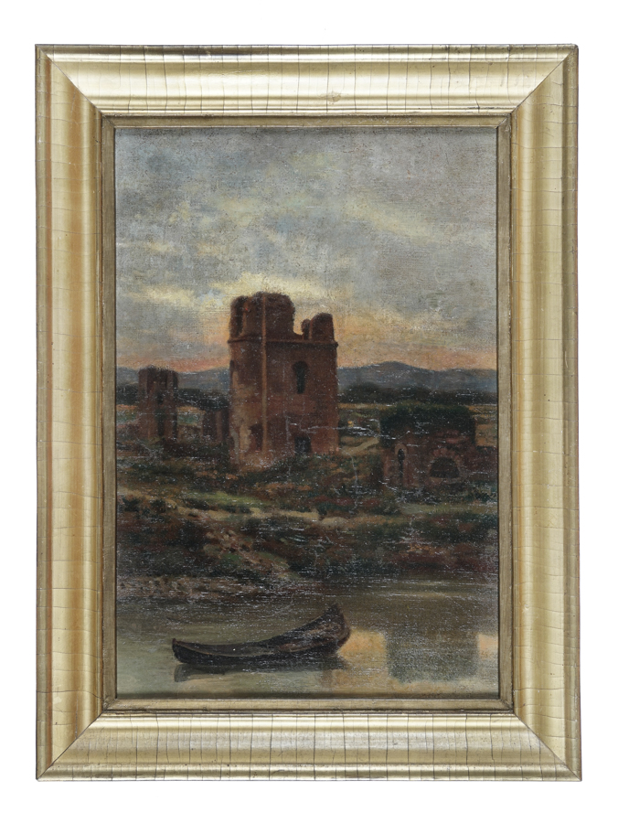 Anonimo del XIX secolo, Roma. Olio su tela. cm 45x30,5. L'opera presenta un delicato gioco di luci sulla linea d'orizzonte. Non è da escludere che l'artista fosse vicino a Nino Costa. Oltre al simile utilizzo del colore troviamo la presenza di soggetti pittorici ricorrenti. (1)