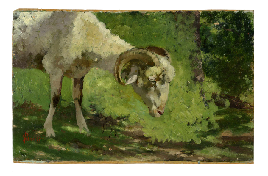 Stefano Bruzzi, Montone. Olio su tavoletta. cm 16,5x25. Firmato in basso a sinistra. Al verso: titolo a matita ed etichetta della Collezione d'arte Mario Galli di Firenze. Dipinto che condensa la poetica di Bruzzi nel volgersi con sguardo intenerito e commosso alle presenze del mondo animale, percepite come affettuose e gentili, memore della lezione di Filippo Palizzi. (1)