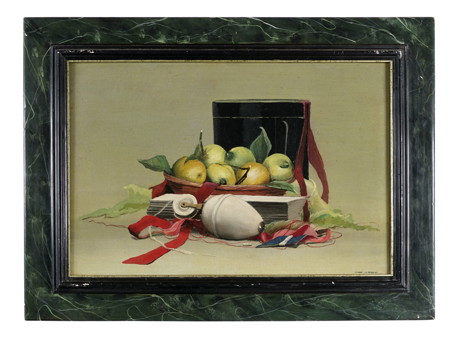 Gianni Cacciarini, Natura morta con nastri. Olio su tavola. cm 40x60. Firmato in basso a destra. Durante tutto l'operato di Cacciarini risalta un certo occhio per le nature morte compositive: utilizzando forti contrasti di colore, un elemento chiave nelle pitture è la rappresentazione del limone, anche qui, adornato da nastri ed oggetti d'uso comune. (1)