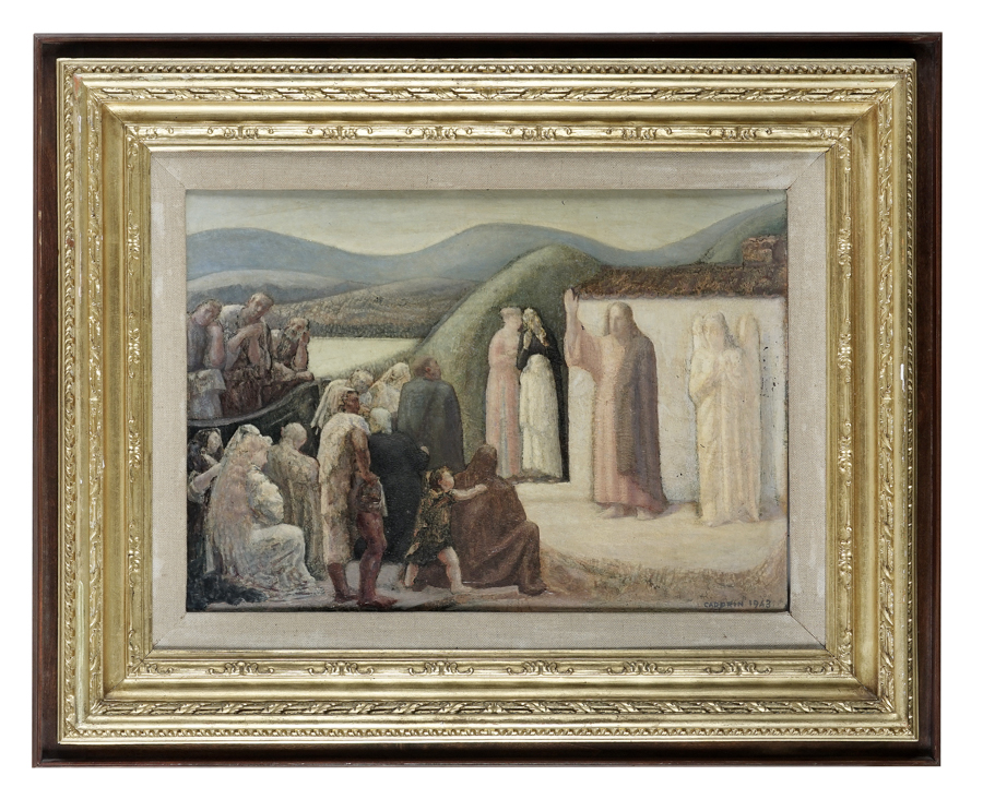 Guido Cadorin, Gesù che parla alle turbe. 1943. Olio su tavola. cm 40,5x57. Firmato e datato all'angolo inferiore destro. Etichetta recante artista, titolo e data applicata al verso del supporto. (1)