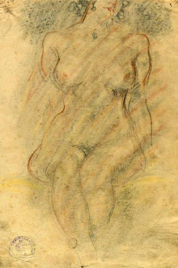 Giovanni Costetti, Nudo femminile. Carboncini colorati su carta. mm 308x205. Firmato a matita in basso a destra. Delicato studio di nudo eseguito durante gli anni presso la Scuola Libera del Nudo a Firenze fondata da Giovanni Fattori. Traccia di questo passaggio rimane nel timbro ad inchiostro blu posto all'angolo inferiore sinistro del disegno. (1)