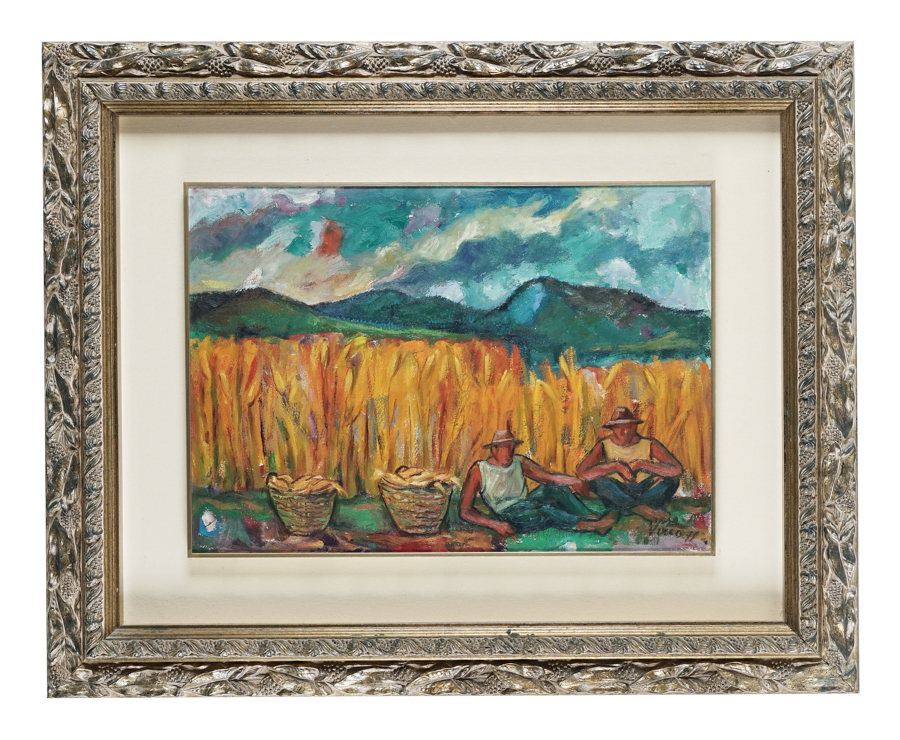 Virio Da Savona, Raccoglitori di granturco. 1971. Olio e tecnica mista su tela. cm 50x70. Firma e data all'angolo inferiore destro. Opera accompagnata dal certificato di autenticità su fotografia de La Piccola Galleria Maestri del Novecento di Savona e archiviata con il numero 70010. (1)
