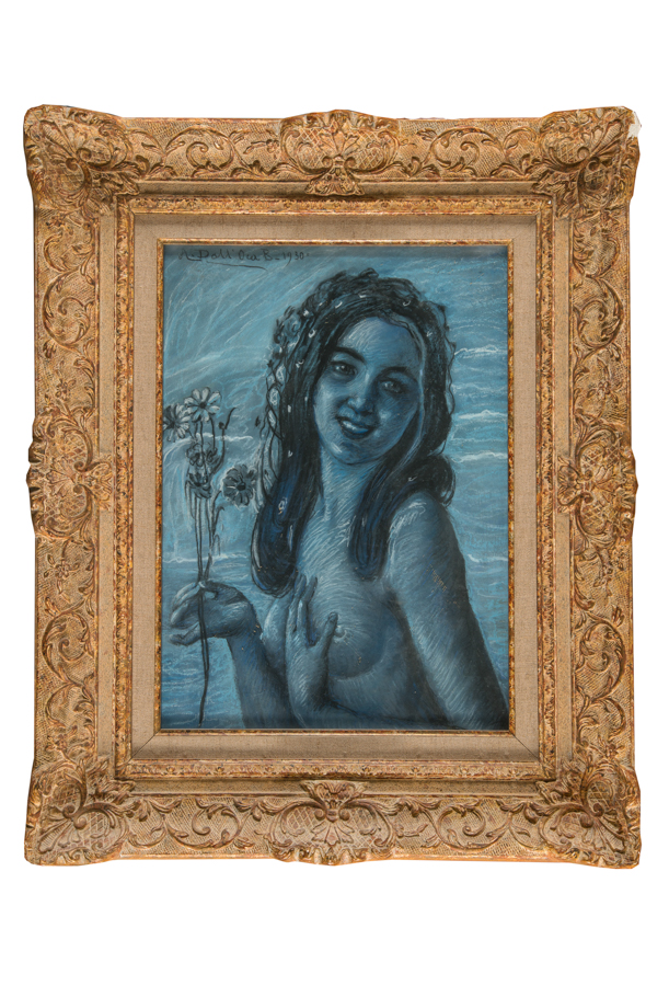 Angelo Dall'Oca Bianca, La ninfa. 1930. Tempera, pastello grasso, matita e carboncino su cartone. cm 44,5x32 (visibili). Firmato e datato in alto a sinistra. Un dipinto vicino al nostro per soggetto e tipologia compositiva e stilistica, ovvero un Nudo femminile del 1941, è passato in asta al Ponte nel giugno del 2022. (1)