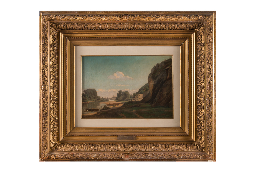 Serafino De Tivoli, Lungo il fiume. Olio su tela. cm 27,3x37. Firma in basso a sinistra. Provenienza, Galleria La Navicella di Savona, la cui etichetta timbrata e contenente i dati dell'opera è applicata al verso. Iscritto in alto all'etichetta a destra: "è stata in mostra nel 1992". Accompagnata dal certificato di autenticità su fotografia della galleria stessa. (1)
