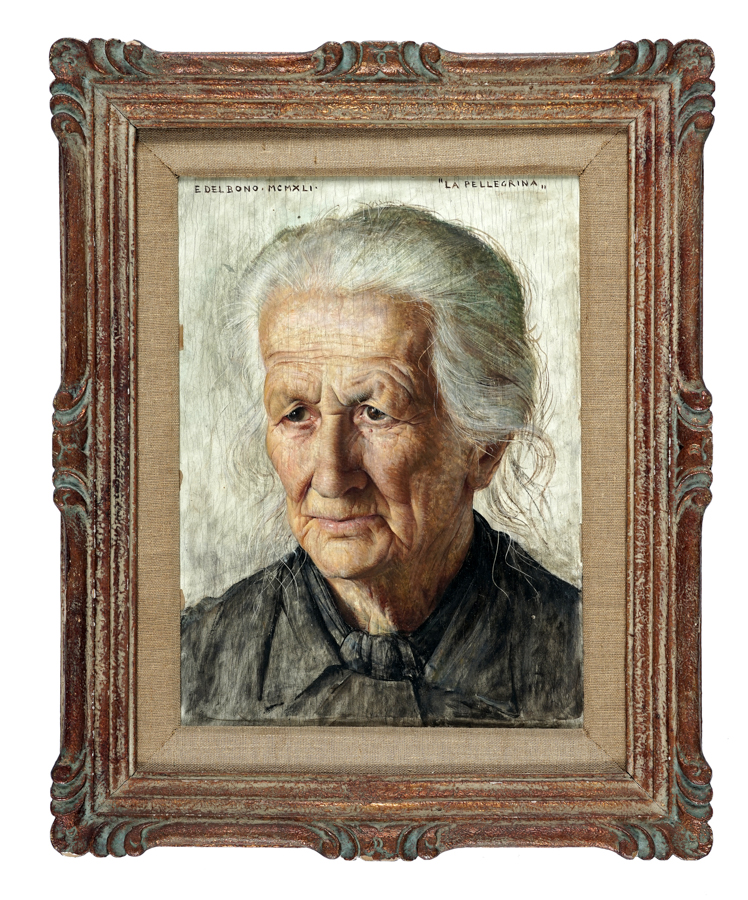 Enrico Del Bono, La pellegrina. 1941. Tempera e matita su tavola. cm 37x27. Firma, data e titolo in alto ai lati. Esposizioni: XCVII Mostra Sociale del 1942, Società di Belle Arti di Firenze, la cui etichetta è riportata all'angolo superiore destro del verso. (1)