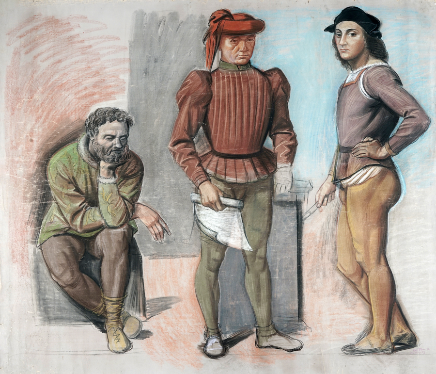 Achille Funi, Raffaello, un pensatore e un messaggero. 1953. Carboncino e pastello grasso su carta greve. mm 1790x1974. Firma, data e luogo (Busto) a matita in basso a destra. Opera archiviata presso l'Archivio Funi di Milano con il codice: P.96-I.56. Quest'opera e le seguenti similari sono i preparatori per gli affreschi eseguiti da Achille Funi e i suoi allievi di Accademia nel 1955 circa a Busto Arsizio. Di questo ciclo di affreschi, purtroppo, non rimane nulla, nè a livello concreto nè a livello di testimonianze; è difficile anche capire la narrazione che il Maestro aveva intenzione di portare avanti, anche per gli accostamenti di personaggi, parecchio eterogenei. Ogni ipotesi, quindi, è piuttosto azzardata. (1)