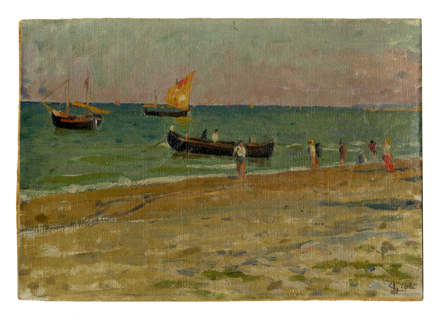 Luigi Gioli, Marina. Olio su tela applicata. cm 21,5x31. Firmata all'angolo inferiore destro. Opera riconducibile ai primi periodi artistici di Luigi Gioli. (1)
