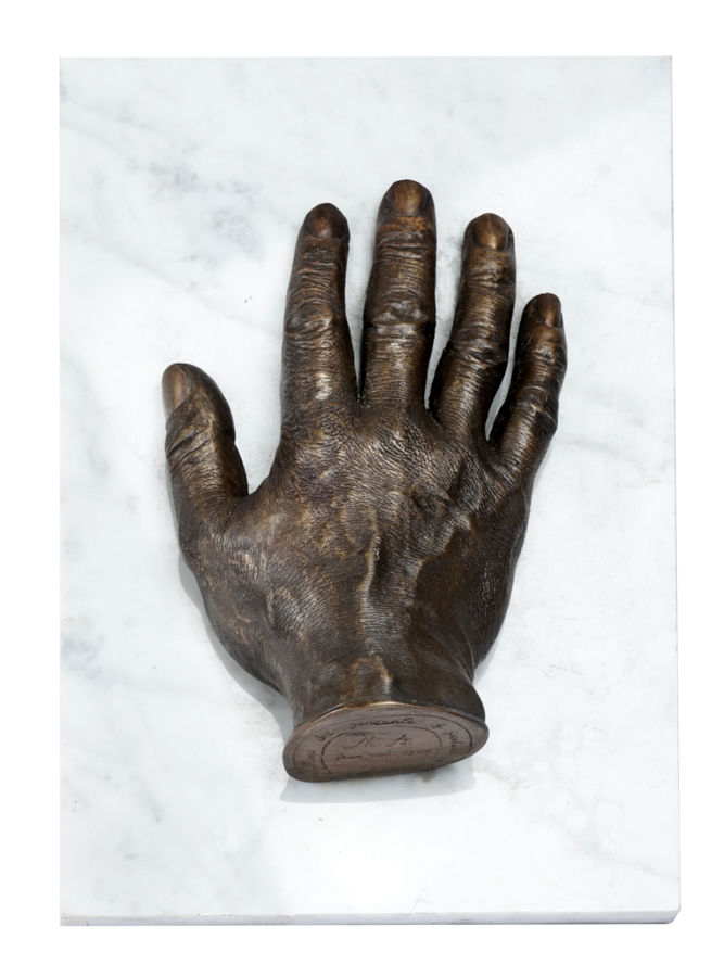 Andrea Malfatti, Mano del Generale G. Garibaldi. 1867. Mano in bronzo su basamento in marmo bianco. Mano: cm 6x12,5x20. Basamento: cm 2x20x30. Nella sezione del polso troviamo incisi titolo, sigla dell'Artista e data di esecuzione. Iscritto: Andrea Malfatti 1867 G. Garibaldi in pennarello a inchiostro bruno sul fondo del basamento. (1)