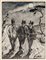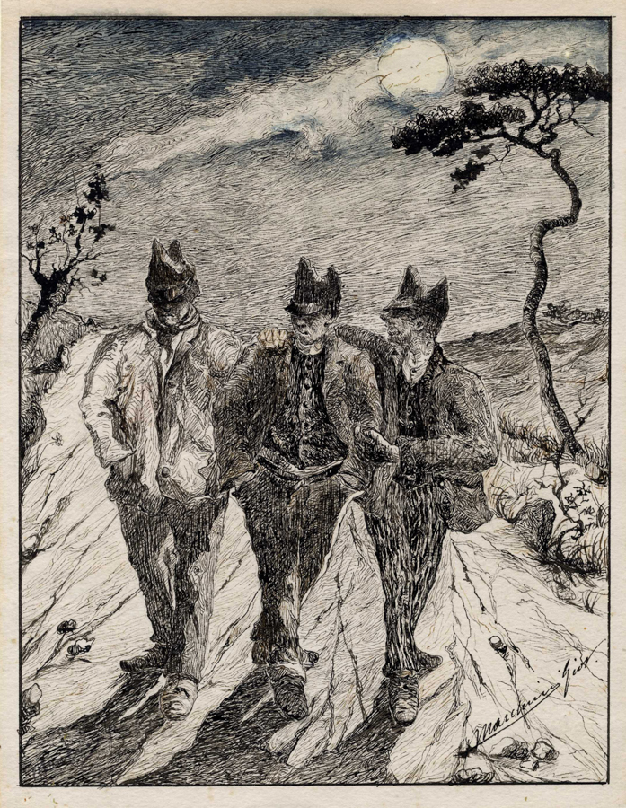 Giovanni Marchini, Soldati. Acquerello e penna e inchiostro di china nero e bruno su carta. mm 236x181. Firmato in basso a destra. Opera tecnicamente notevole, elevata dall'uso dell'acquerello blu per ombreggiare il cielo ed Il doppio colore dell'inchiostro di china per dare dettaglio alle aree più scure dell'opera. (1)