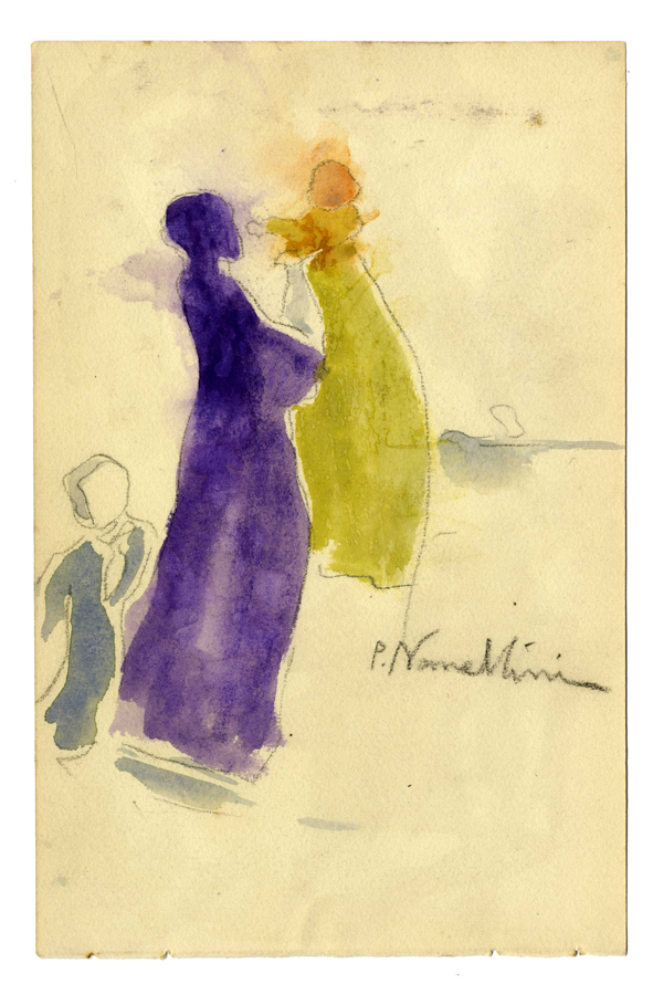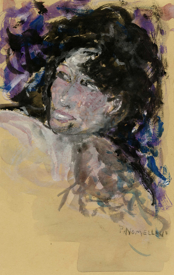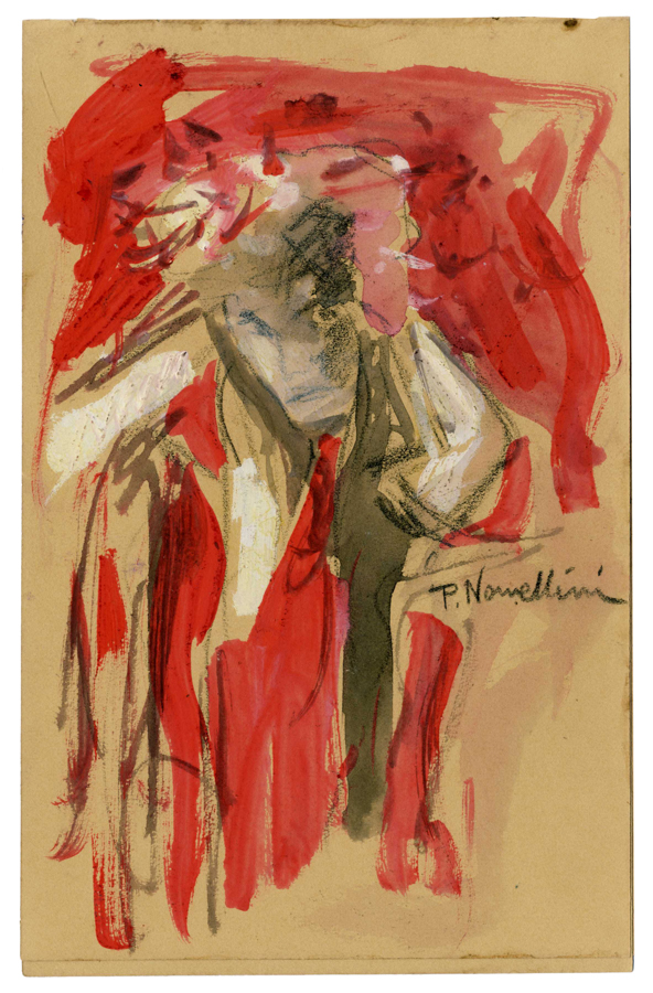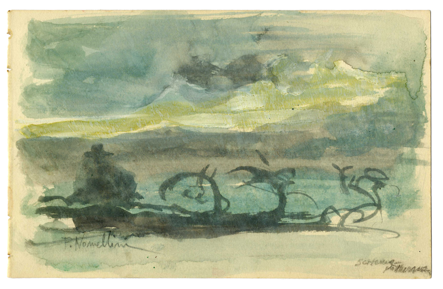 Plinio Nomellini, Lotto composto di 6 disegni. Raccolta di 6 acquerelli su carta. mm 220x140 cad. Tutte le opere sono firmate a matita al margine inferiore, l'unica in formato orizzontale presenta un'iscrizione poco leggibile all'angolo inferiore destro. Tre acquerelli sono stati realizzati su carta tabacco. Ogni opera si propone come bozzetto emotivo, ognuna con una palette colori ben delineata. Compongono il lotto potenti ritratti accostati a meditativi scenari. Contenuto entro cartella oblunga in tela. (7)