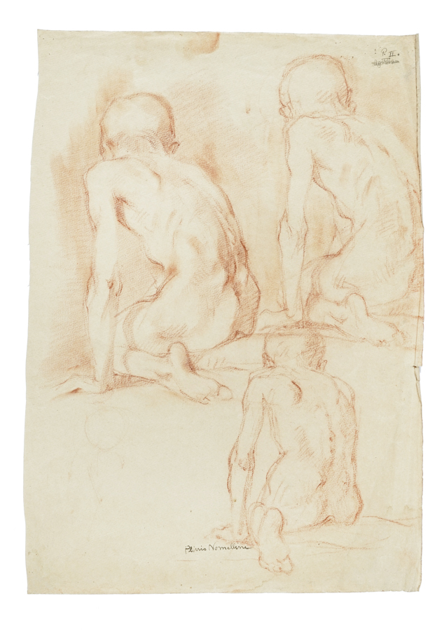 Plinio Nomellini, Studi anatomici. Sanguigna su carta. mm 500x350. Firmata a penna e inchiostro di china nero al margine inferiore. Delicatissimo studio dell'anatomia della schiena di un ragazzo. (1)