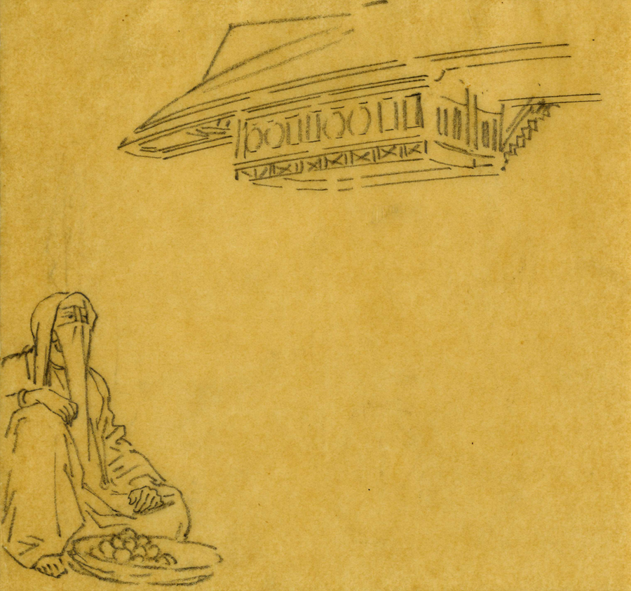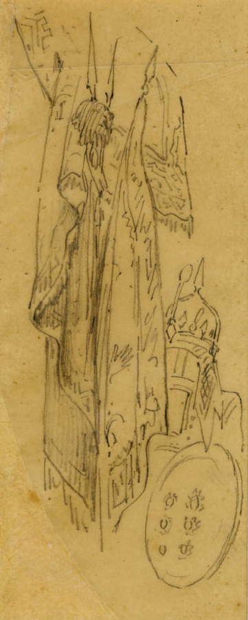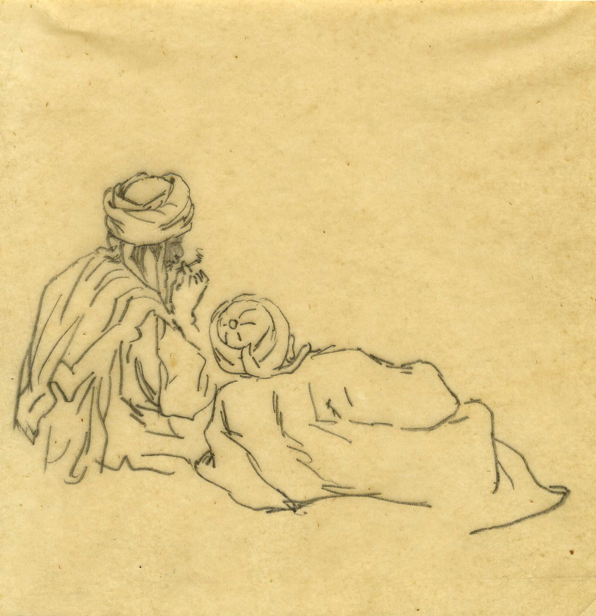 Amedeo Preziosi, Lotto composto di 5 disegni. 1857-70. Raccolta di 5 matite su carta lucida. mm 160/295x125/355. LEONE, 54, 106. 208. Tre delle cinque opere sono catalogate nella pubblicazione del Settembre 2011 di Preziosi Amedeo. I titoli delle opere repertoriate sono: Drappi, elmo e scudo, Fellah venditrice di arance; Studio di architettura e Trofei di spade e scimitarre; Ceppi funerari a Eyüp. Provenienza: Galleria Alessandra Di Castro Antiques a Roma. (5)