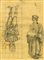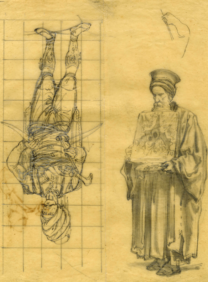 Amedeo Preziosi, Bashi Bazouk; Monaco copto. 1857. Matita su carta lucida. mm 352x255. LEONE, 60. Doppio studio di figure orientali, Bashi Bazouk (sulla sinistra) presenta la quadrettatura di riporto pittorico, mentre Monaco copto accenna un chiaro/scuro a carboncino sulle vesti. Provenienza: Galleria Alessandra Di Castro Antiques a Roma. (1)