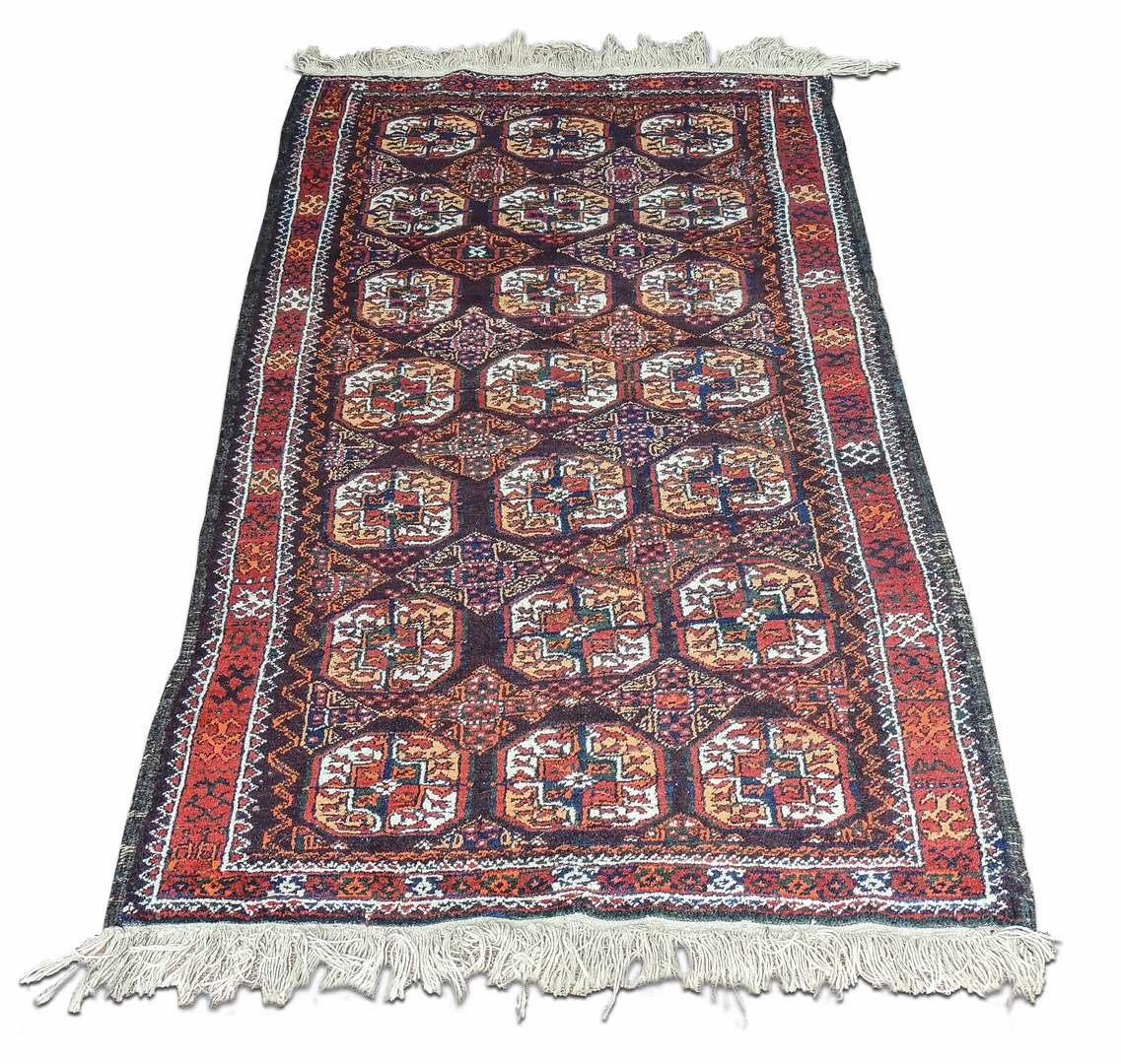 TAPPETO BUKARA - BUKARA RUG fondo rosso scuro, campo con medaglioni geometrici nei toni del rosso, verde e avorio cm 98x198