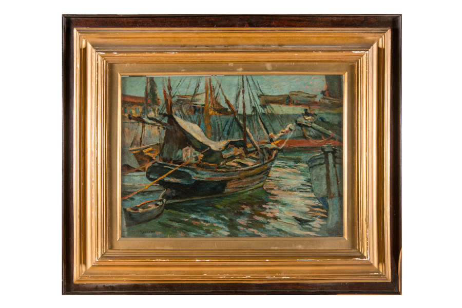 Mario Puccini, Barche nel porto. Olio su cartone. cm 31,5x42,5. Firmato all'angolo inferiore sinistro. Etichetta recante titolo ed artista incollata al verso dell'opera. La rappresentazione di imbarcazioni in stallo è un tema ripreso in più volte da Puccini, particolare attenzione è sempre data al meraviglioso gioco di riflessioni che si specchia sulla superficie dell'acqua. Dipinti come Darsena con barconi ed Il porto condividono le stesse espressività pittoriche. (1)