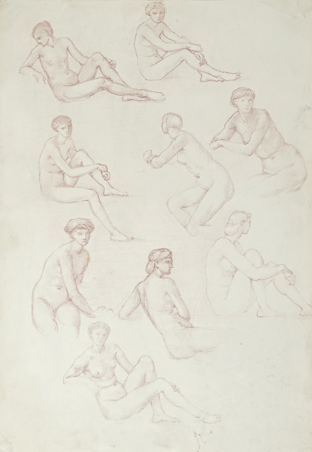 Dante Gabriele Rossetti [attribuito a], Album con nucleo di 12 disegni. Nucleo di 12 disegni diversificati per tecnica, supporto e soggetti rappresentati, ma applicati al medesimo album. Si allega documento manoscritto in possesso di Tammaro De Marinis, ultimo proprietario, nel quale sono elencate le provenienze dei disegni stessi, ovvero la collezione di William Graham e il successivo passaggio d'asta del 2 aprile del 1886 (l'anno successivo alla morte del mecenate) da Christie Manson&Woods in un'asta dedicata alla sua collezione (Catalogue of the important collection of pictures in oil and drawings in watercolours, formed by that well-known amateur William Graham, Esq., deceased. Late of Grosvenor Place: which (by Order of the Executors) will be sold by auction, by Messrs. Christie, Manson & Woods, at their great rooms, 8 King Street, St. James Square, on Friday, April 2, 1886, and following day, and on Thursday, April 8, 1886, and two following days, at one o' clock precisely); cita, poi, la proprietà di Charles Fairfax Murray. William Graham è stato un grande uomo d'affari e mecenate dell'arte rinascimentale italiana, ma la sua importanza non è solo come acquirente e protettore ma anche come personalità che, con la sua collezione di arte italiana, ha contribuito ad ispirare alcuni degli artisti che poi lui stesso ha sostenuto, come Edward Burne-Jones e lo stesso Dante Gabriel Rossetti. Charles Fairfax Murray è stato un pittore, mercante, collezionista, benefatore e storico dell'arte, nonchè uno degli esponenti dei Preraffaelliti. Fu assistente di Edward Burne-Jones e stabilì velocemente un legame anche con Dante Gabriel Rossetti, nel cui studio entrò da giovanissimo, William Morris e Philip Webb. A seguito di ulteriori approfondimenti siamo giunti all’ipotesi che i disegni, nella totalità o in parte, possano essere stati eseguiti da Charles Fairfax Murray che era stato allievo sia di Rossetti che di Burne-Jones. Alcune figure allungate presenti nell’album ricordano proprio lo stile di quest’ultimo nel cui studio Murray era entrato nel 1867. Murray eseguì alcune copie molto fedeli dei dipinti di Rossetti Beata Beatrix, Salice d’Acqua ed Elena di Troia, questi ultimi due oltretutto presenti nell’album come studi. Come scritto nella biografia Treccani “Assorbì talmente la maniera del maestro che non di rado opere sue furono attribuite al Rossetti”. L’artista si trasferì in Italia nel 1872 dove collaborò con John Ruskin e si stabilì a Firenze. Fu inoltre importante punto di riferimento per il pittore senese Ricciardo Meacci indirizzandolo allo studio dei quattrocentisti. Anche se tornò in Inghilterra nel 1882, mantenne rapporti col nostro paese dove era rimasta la moglie. Nel frattempo aveva sviluppato interesse per la bibliofilia e il commercio antiquario, attività che evidentemente fu anche alla base dei rapporti con Tammaro de Marinis che tra l’altro scrisse il suo primo profilo biografico nell’Enciclopedia Treccani. Beneficò largamente - con doni di quadri e di denaro - le pubbliche gallerie del suo paese, in special modo la National Gallery di Londra e il Fitzwilliam Museum di Cambridge e nel 1904 cedette la sua collezione di più di ottocento disegni di Preraffaelliti al Birmingham Museum and Art Gallery. La questione rimane comunque aperta e pertanto la raccolta viene presentata in asta come attribuita. Questa scheda revisionata sostituisce quanto riportato nel catalogo cartaceo. L'album è di cm 55,5x39. Al contropiatto anteriore è applicato in alto a destra un ex libris con iscritto a penna e inchiostro di china bruno: "Feathery Hotel Worcester". Sotto è applicata una targhetta con stampato: "Drawn in chalk by Dante G. Rossetti". 1) Matita su carta lucida. mm 380x530. Soggetto simile a Morning Music (1864). 2) Studio di panneggi. Carboncino e pastello bianco su carta tabacco. mm 505x360. 3) Studi di nudi femminili. Pastello rosso su carta greve. mm 515x360. 4) Studio per Water Willow. Carboncino e pastello rosso su carta lucida. mm 400x326. 5) Studio di figura femminile. Carboncino e rialzi a biacca su carta tabacco. mm 355x450. 6) Studio per Regina Cordium. Matita e pastello rosso su carta lucida. mm 215x183. 7) Studio di panneggio. Carboncino e pastello bianco su carta tabacco. mm 415x265. 8) Studio per Lucrezia Borgia si lava le mani dopo aver ucciso il marito. Matita su carta lucida. mm 480x335. La tematica del lavaggio delle mani, che ha assunto la connotazione del disinteressarsi di una faccenda, è presente in altri capolavori di Rossetti, quali La bella mano del 1874 e Lavarsi le mani del 1865. 9) Studio di nudo femminile di schiena. Pastello rosso su carta breve. mm 310x200.10) Studio di nudo femminile. Pastello rosso su carta. mm 375x200. 11) Studio per Elena di Troia. Matita e pastello rosso su carta lucida. 480x315. La quadrettatura riporta annotazioni di misurazioni varie. La stessa tipologia di collana la ritroviamo nell'opera Regina Cordium, mentre delle similitudini compositive nella Bocca baciata e nel Ritratto della Signora Morris. 12) Studio per Astarte Syriaca. Matita su carta lucida. mm 303x205. (1)