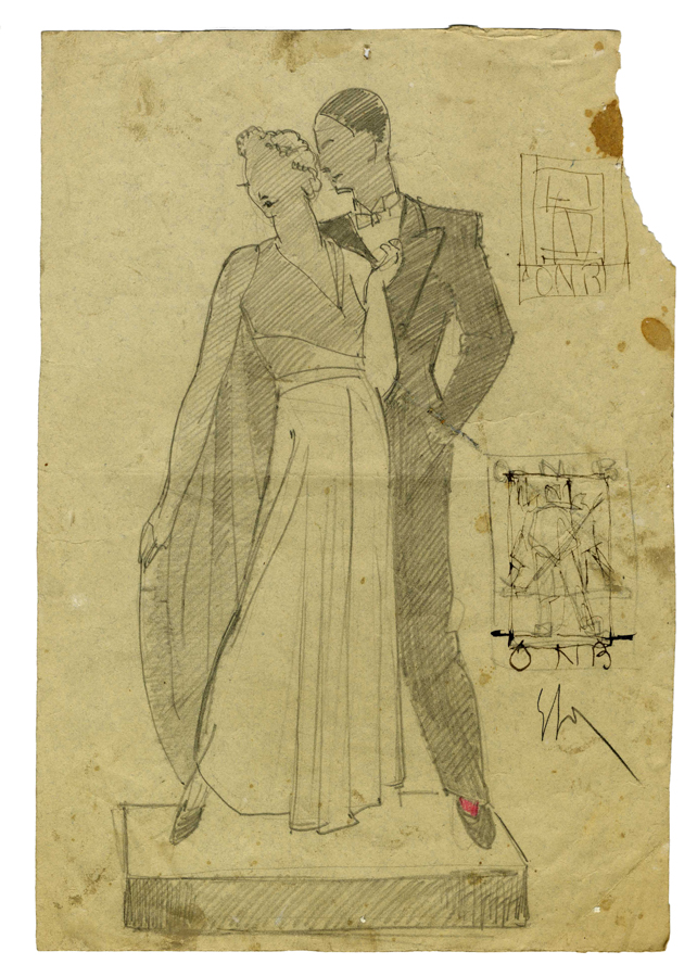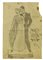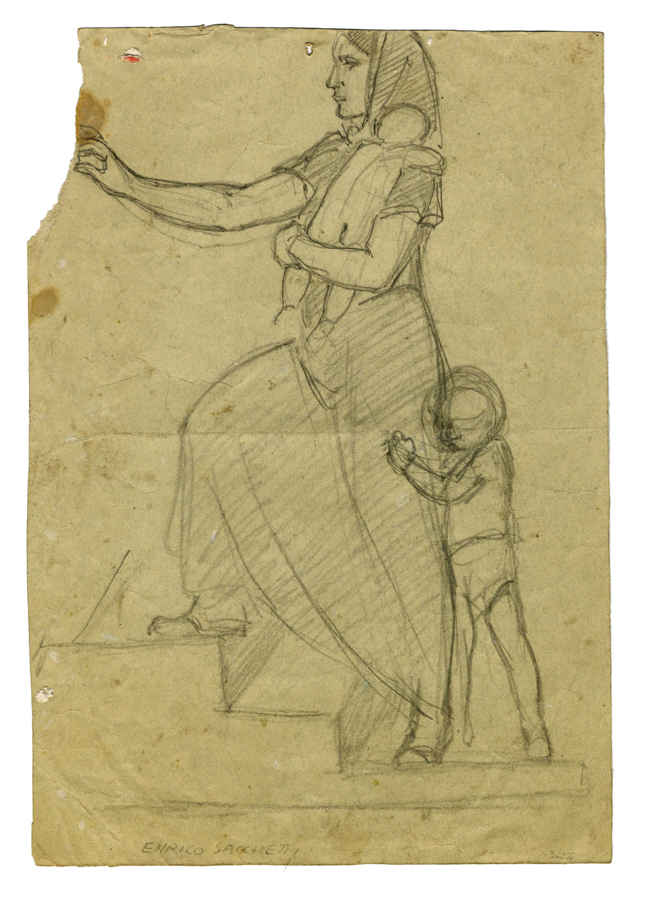 Enrico Sacchetti, Coppia galante. Matita e pastello colorato su carta. mm 310x215. Firmato al margine destro, iscrizione recante nome dell'artista al margine inferiore del verso, dove troviamo un ulteriore bozzetto ritraente una madre con bambini. Vicino alla coppia del recto figurano un paio di schizzi aggiuntivi siglati "ONB". (1)