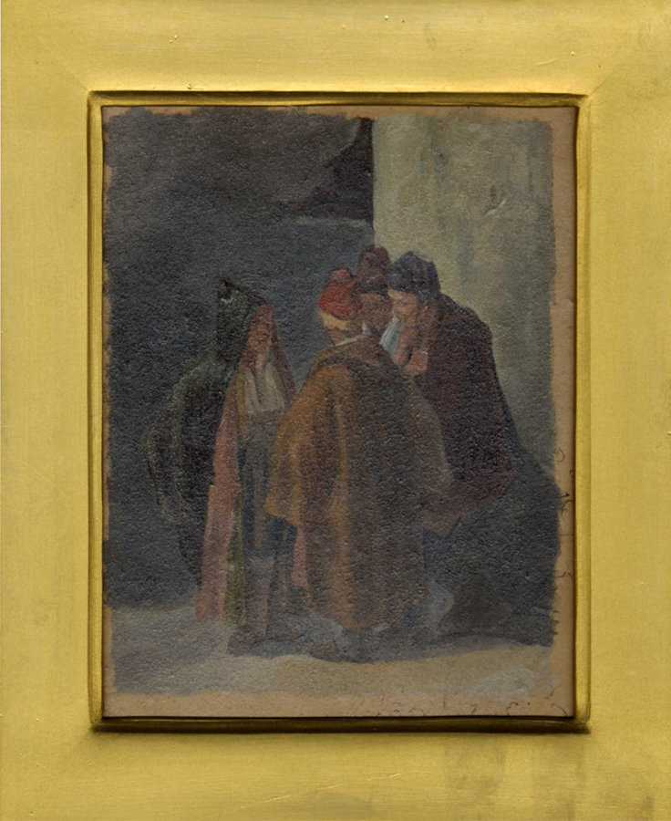 Stefano Ussi, Mercanti. Olio su carta spessa. cm 16,5x13,5. Indicazione di provenienza ed acquisto iscritti a penna a sfera blu al verso del cartoncino di supporto posteriore. Opera non firmata, come spesso succedeva nella realizzazione di bozzetti simili dell'artista. (1)