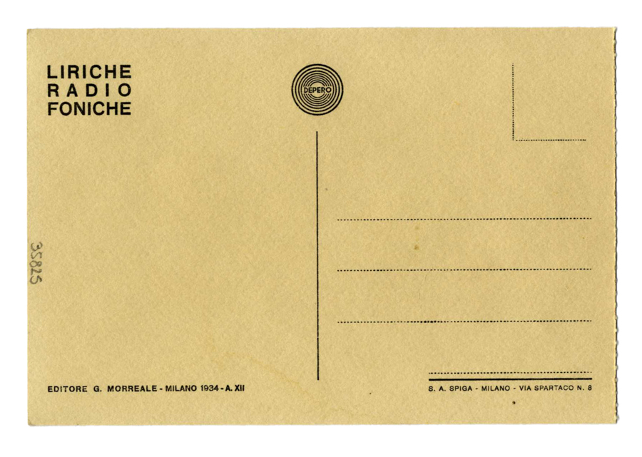 Fortunato Depero, Liriche radiofoniche. 1934. Litografia. mm 140x95. Cartolina pubblicata dall'editore Morreale. Sitografia: http://www.arengario.it/opera/liriche-radiofoniche-199/. Così l'artista: "Queste mie liriche radiofoniche sono espressioni adatte per la trasmissione a distanza. L'ascoltare non è più unicamente raccolto in un salotto silenzioso e romantico, ma si trova ovunque: per strada, nei caffè, in aeroplano, sui ponti di una nave, in mille atmosfere diverse. Quindi il carattere della lirica radiofonica deve essere spaziale, volitivo, sonoro, inaspettato, magico. In una parola la poesia radiofonica da me inventata dev'essere l'espressione lirica di un purissimo stato d'animo.". (1)