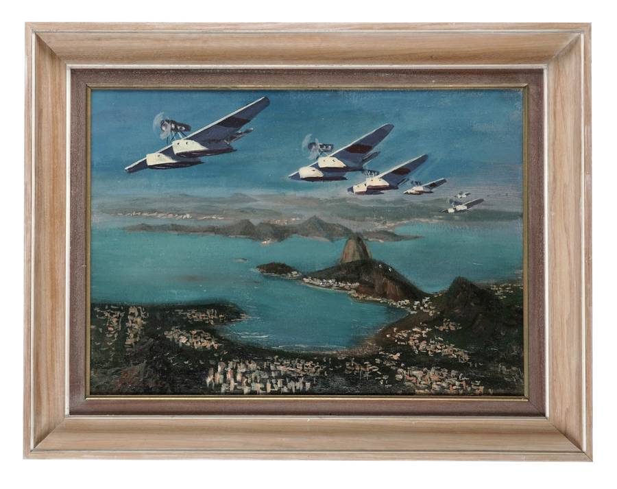 Umberto Di Lazzaro, Trasvolata Italia-Brasile. 1930. Olio su tela. cm 49x69,5. Firmato in basso a sinistra. Al verso della cornice francobollo applicato de "Crociera aerea transatlantica Italia-Brasile 1930 anno (X)". La figura dell'aereo in volo è una costante nell'operato di Di Lazzaro. Molteplici sono gli esempi nei manifesti, come nelle sue serie di crociere aeree, mentre in pittura si conoscono pochi esemplari di così elaborata fattura. (1)