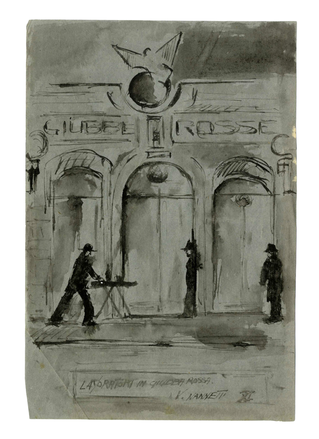 Vieri Nannetti, Lavoratori in giubba rossa. 1933. Acquerello su carta antracite. mm 245c160. Titolato, firmato e datato con la numerazione dell'era fascista al margine inferiore. (1)