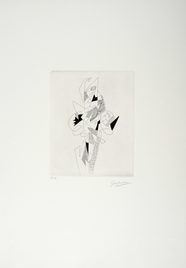 Gino Severini, Arlecchino. 1964. Acquaforte su carta filigranata. mm 245x195. Foglio: 650x460. meloni, 42. Firmata a matita in basso a destra e numerata in basso a sinistra. Es. 49/102. Arlecchino e Gino Severini hanno avuto un rapporto continuativo nella vita del pittore. La maschera bergamasca ha accompagnato il pittore toscano nelle opere cubo-futuriste degli anni Dieci del Novecento, poi nella svolta del rappel à l'ordre degli anni Venti, dove a prevalere è una figuratività "neoclassica" con sfumature metafisiche. Arlecchino, qualche volta accompagnato da altre maschere e altri personaggi, sarà con Severini anche negli anni del secondo dopoguerra, quando l'ispirazione cubista tornerà a improntare le opere del maestro. (1)
