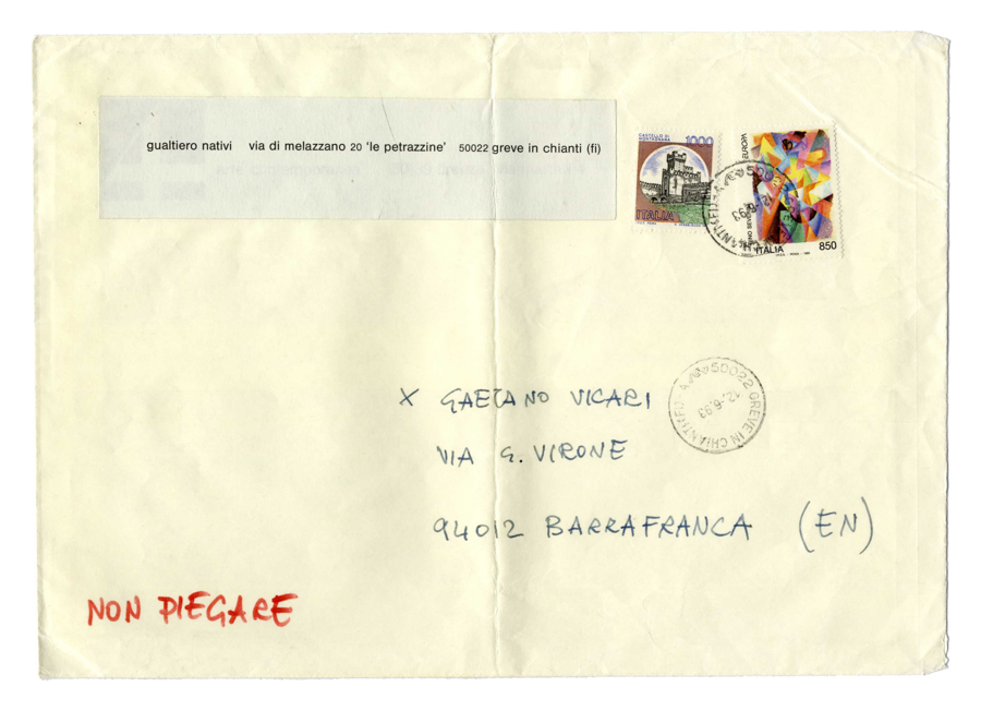 Autori vari, Lotto composto di 3 lettere. 1996. Raccolta di 3 piccoli collage di augurio da artisti vari. mm 100/260x115/172. Risposte di auguri e ringraziamenti per Gaetano Vicari da Gualtieri Nativi, Piero Guccione e Christo Javachev, ognuno dei quali ha allegato insieme al messaggio una piccola opera a base stampa con collage applicato. Le opere sono accompagnate da involucri viaggiati. (7)