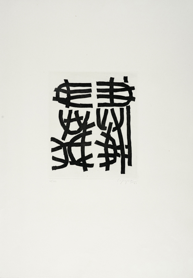 Giuseppe Capogrossi, Senza titolo. 1964. Acquaforte. mm 248x210. Foglio: mm 650x462. Firma e data a matita in basso a destra e tiratura in basso a sinistra. Doppia filigrana agli angoli sinistri, quella all'angolo in basso a destra è de Il Bisonte, che ha stampato l'opera. Es. 49/102. (1)