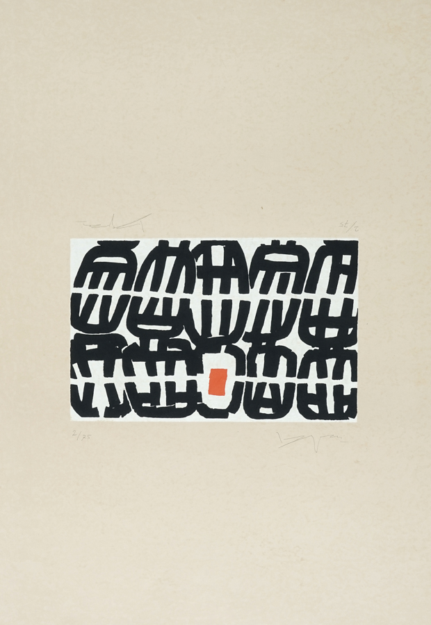 Giuseppe Capogrossi, Composizione. Serigrafia su fondino bianco su carta rosaspina applicata interamente a carta Giappone. mm 180x275. Foglio: mm 640x480. Firma a matita in basso a destra e in alto a sinistra e tiratura in basso a sinistra e in alto a destra. L'opera è capovolgibile, ecco perchè la doppia firma e la doppia tiratura. Es. 2/75. Rara. Provenienza: Galleria Angolare, Milano; importante collezione milanese. (1)