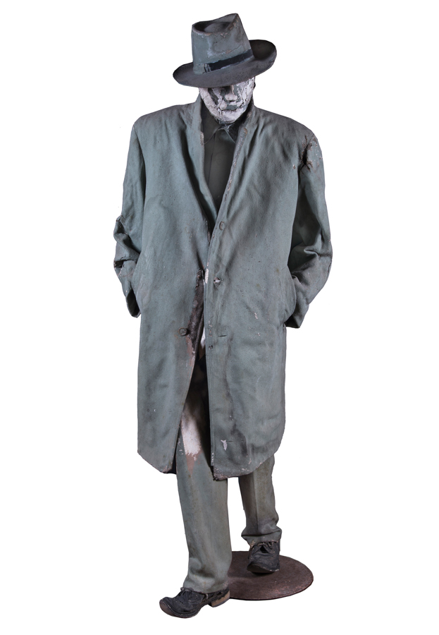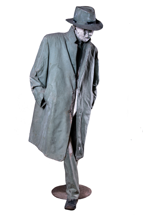 Jean-Michel Folon, L'homme. Anni '80 del XX secolo. Gommapiuma, ferro, cappello, cappotto, camicia, pantaloni, scarpe, gesso, cemento e colore. cm 170x50x60. L'opera era stata commissionata da Giovanni Enea (detto Nino) Baj-Macario, Conte di Castignano, per il Castello del Trebbio. L'idea era, poi, di far fondere in bronzo il modello. L'opera, però, non ha incontrato il gusto del Conte, il quale ha interrotto il progetto dell'opera. Provenienza: Enrico Baj-Macario. (1)