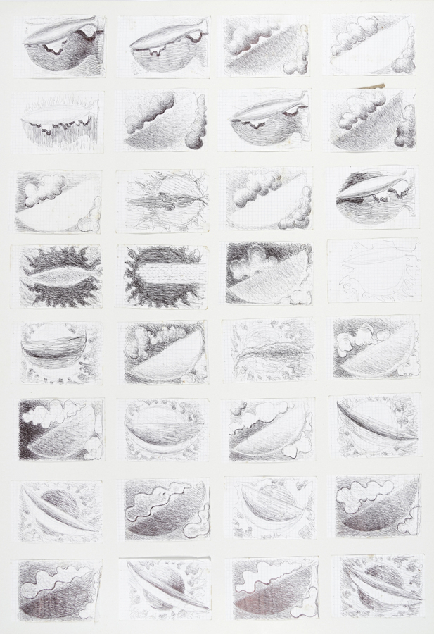 Marcello Guasti, Lotto composto di 33 disegni. 1978. 1) Progetto n. 1, "14 Parti". 1978. Pastelli colorati su carta millimetrata. mm 750x830. Titolo e tecnica a matita all'angolo inferiore sinistro. Firmato e datato a matita all'angolo inferiore destro. 2) Senza titolo. Raccolta di 32 penne a sfera nere su carta quadrettata applicate a cartone di supporto. mm 150x100 cad. Supporto: mm 710x1010. Ogni disegno è realizzato su carta da block notes e contiene ognuna una variante dello stesso tema di fondo. (2)