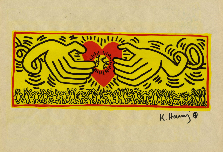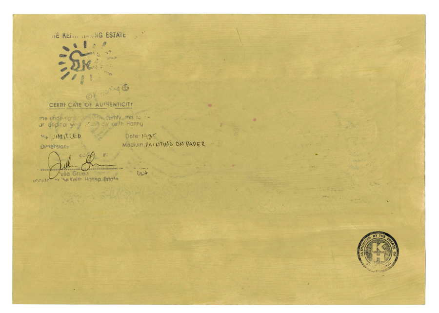 Keith Haring, Untitled. 1985. Tempera su carta. cm 21x29,5. Firma in basso a destra a pennarello nero. Al verso timbro del certificato di autenticità del Keith Haring Estate con dati e firma di Julia Gruen a penna a sfera nera. In basso a destra ulteriore timbro a inchiostro nero: "Authorized by the Estate of Keith Haring". L'opera è accompagnata dal certificato di autenticità di Rare&Signed con il codice: R&SD30349207282778901 e dalla perizia calligrafica sulla firma dell'artista. Questa meravigliosa opera è un inno alla gioia: la padronanza del colore giallo sottolinea a livello emotivo la danza Trionfo del Bene in corso al margine inferiore dell'opera. L'umanità, gioiosa, è abbracciata da due arti cartooneschi e che porgono, allo stesso tempo, un cuore-terra, una madre natura amorevole. Il mondo è unito in un cuore pulsante di compartecipazione, solidarietà, condivisione e amore. (1)