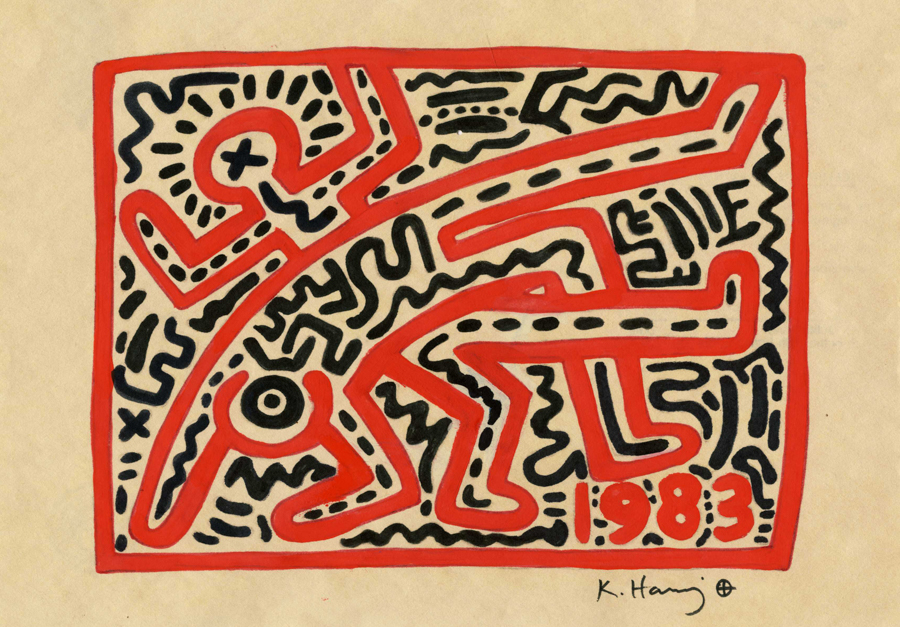 Keith Haring, Untitled. 1983. Tempera e pennarello su carta. mm 205x295. Firma e data in basso a destra. Al verso tre timbri: "Authorized by the estate of Keith Haring" a inchiostro nero in basso a destra, a sinistra il timbro a inchiostro blu di certificato di autenticità del Keith Haring Estate, con informazioni aggiuntive e firma di Julia Gruen a penna e inchiostro di china neri. La data del timbro di autentica è il 05/08/98. L'opera è accompagnata dal certificato di autenticità di Rare&Signed con il codice: R&SD303492976211. (1)